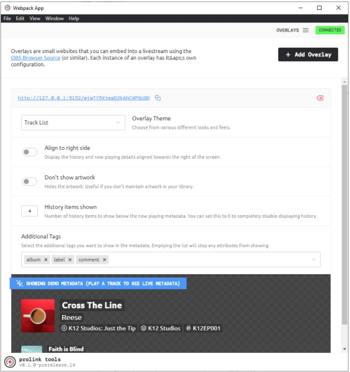 Empecemos con Prolink Tools, una herramienta desarrollada por Evan Purkhiser y disponible en versión beta gratuita para Windows, Mac y Linux, con una finalidad muy concreta: generar un overlay para insertarlo en tu retransmisión con OBS o StreamLabs donde aparezca el nombre del track que estás pinchando, así como otra información como el artista, referencia del sello, fecha de lanzamiento… en definitiva mostrar los metadatos contenidos en el etiquetado de la canción. ¿Cómo lo hace? Muy simple: debes tener tu ordenador conectado a la misma red Pro DJ Link de reproductores Pioneer que estés usando, de esa forma el software «captura» la información de las pistas que circula por tu red como si fuera un dispositivo Pioneer más.